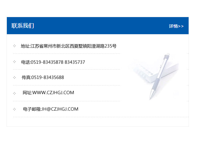地址:常州市新北區友邦商務大廈1幢16、17層  電話:0519-85101652  傳真:0519-85112595  郵編:213022  網址:www.cz-jiayue_cn.hzlhbs.com  郵箱:xiajifengaa@163.com